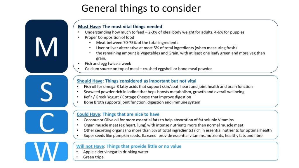 I categorised what I learned into each bucket, so that I knew what I first had to focus on and get right and allowed me to deliver immediate value to Goose’s diet while I was still learning what I could about home cooking.